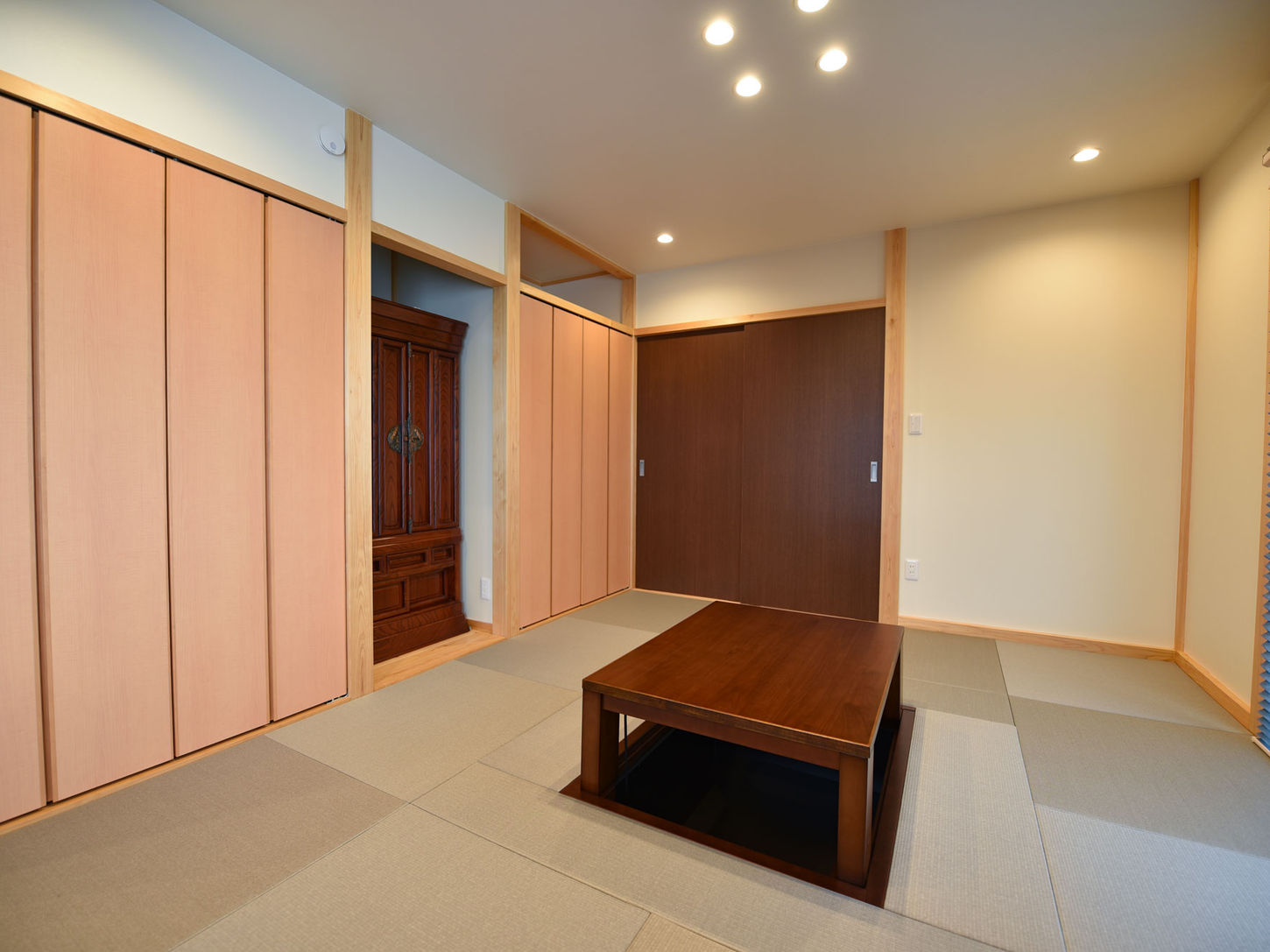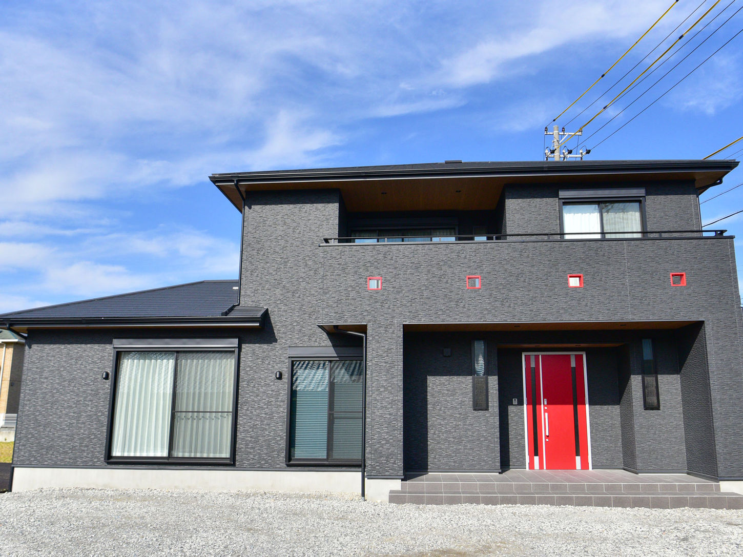 深みのある色調と洗練された水平ラインで構成したシックな外観が印象的な注文住宅のデザイン・施工を実施させていただきました。ゆとりある玄関ホールから光あふれる廊下へと続く動線は住まい全体に開放感をもたらしつつも無駄のない設計を実現。リビングでは家族が自然と集いゆったりと過ごせる広さを追求し、高天井で上質なくつろぎを演出しています。開放的なカウンターキッチンはシンプルなフォルムに収納や作業効率を凝縮し会話が弾む空間を創出。さ らにモダンな和室では伝統的な畳や格子をモダンにアレンジしリビングとの一体感を保ちながらも和の寛ぎを提供しております。