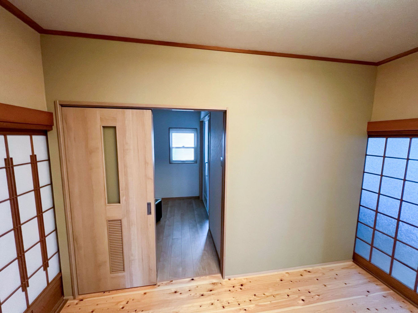 隣接する畳敷きの和室をフローリング敷きの和洋室へリフォームしました。脱衣場側の既存壁を一度撤去し、梁構造を活かした新設壁をクロス仕上げに変更。もとの土壁「聚楽壁」に近い質感を、数あるクロスの中から厳選してご提案。障子やガラス戸の上部に残る伝統的な壁とのコントラストが、現代的なフローリングと調和しています。